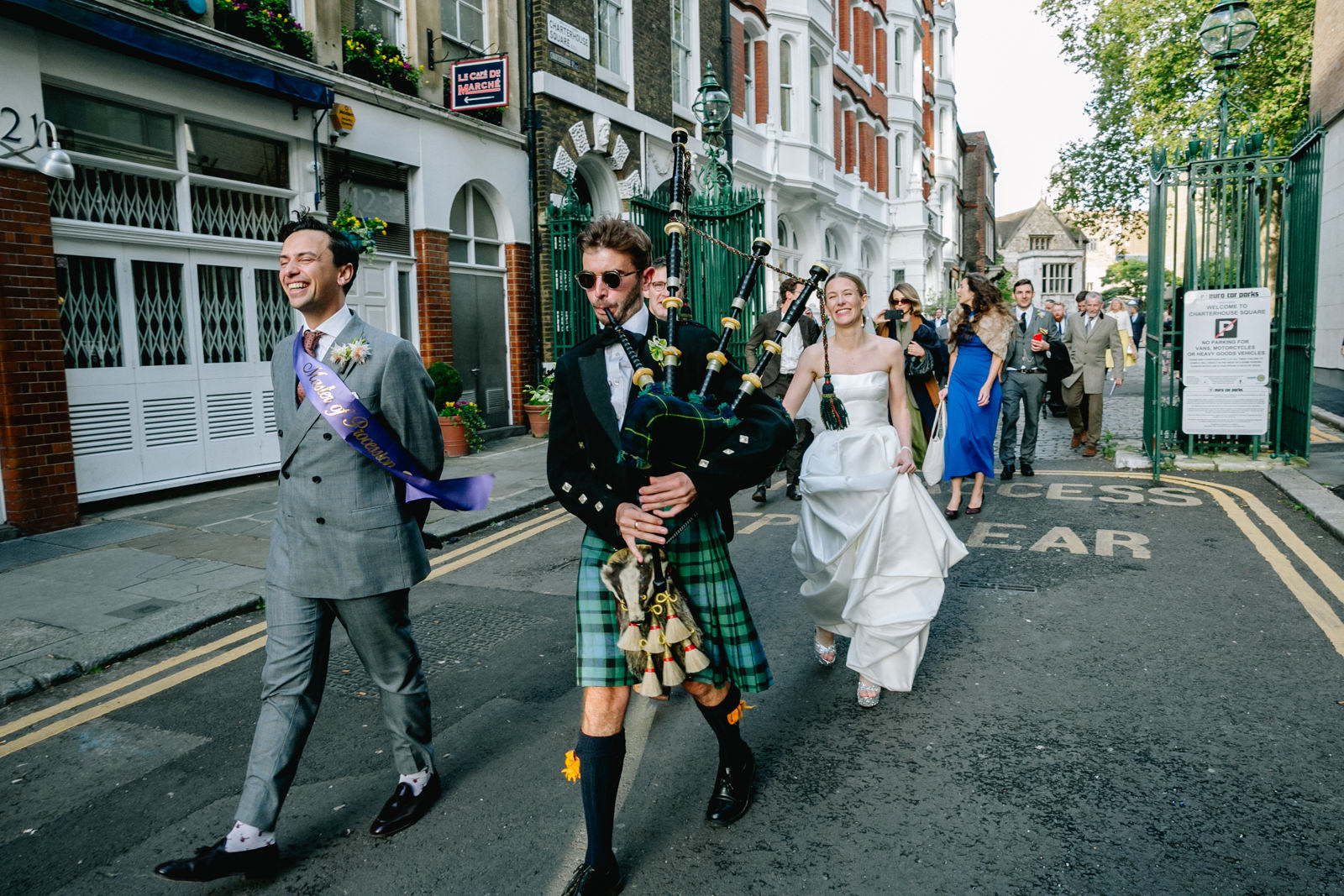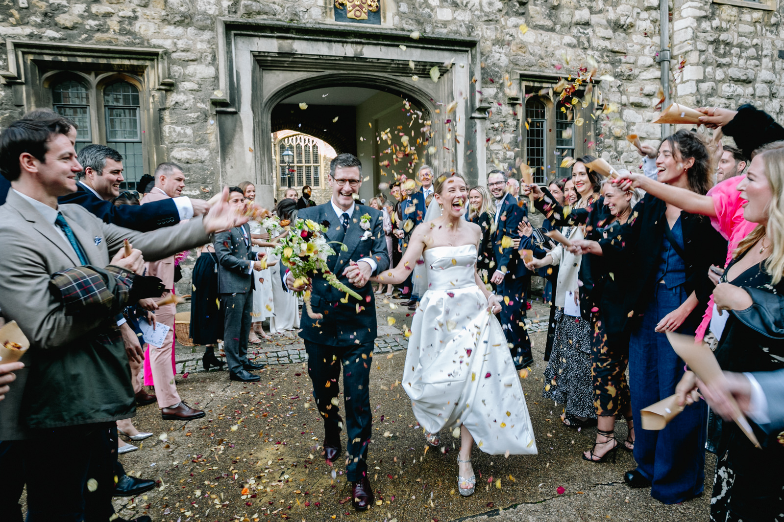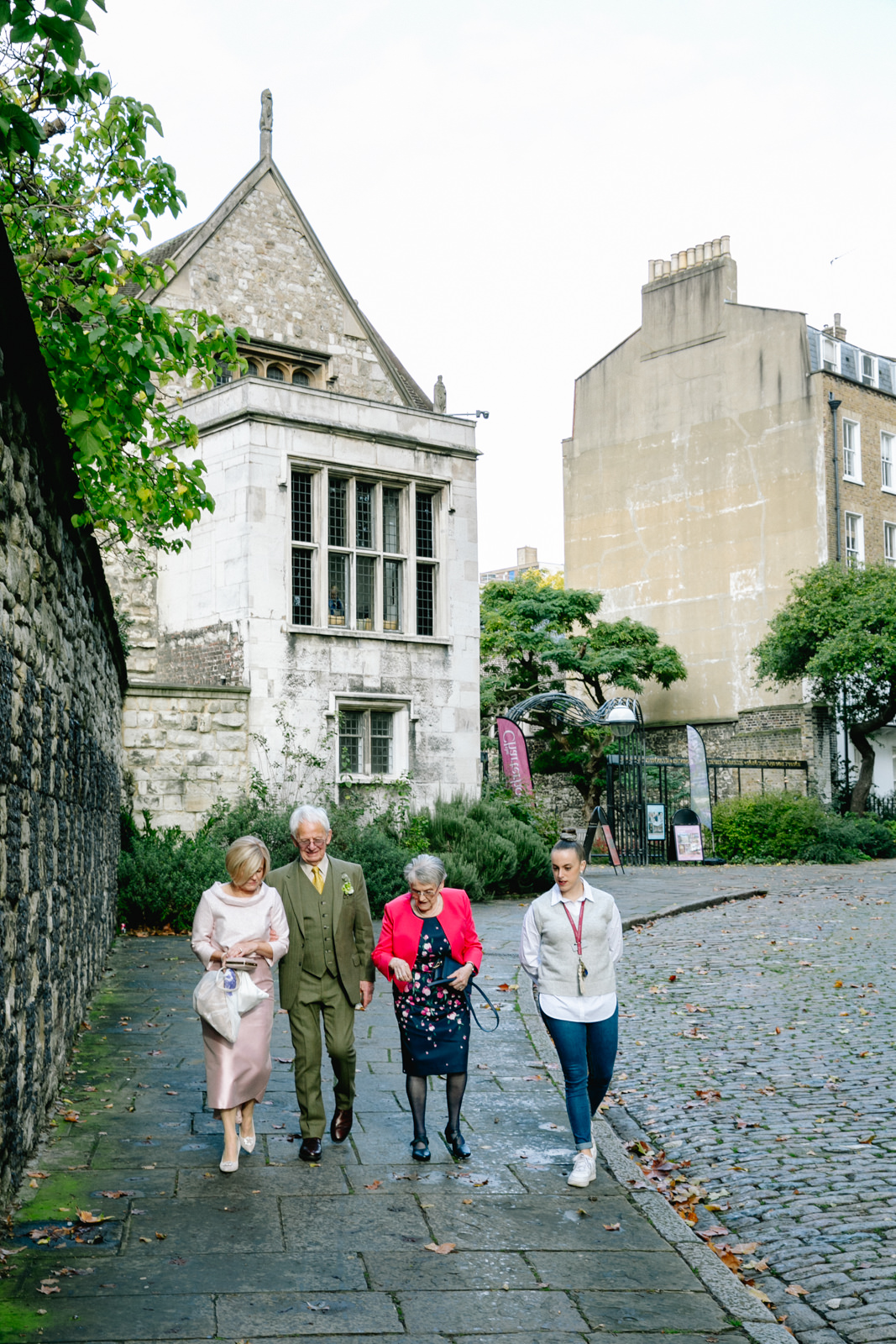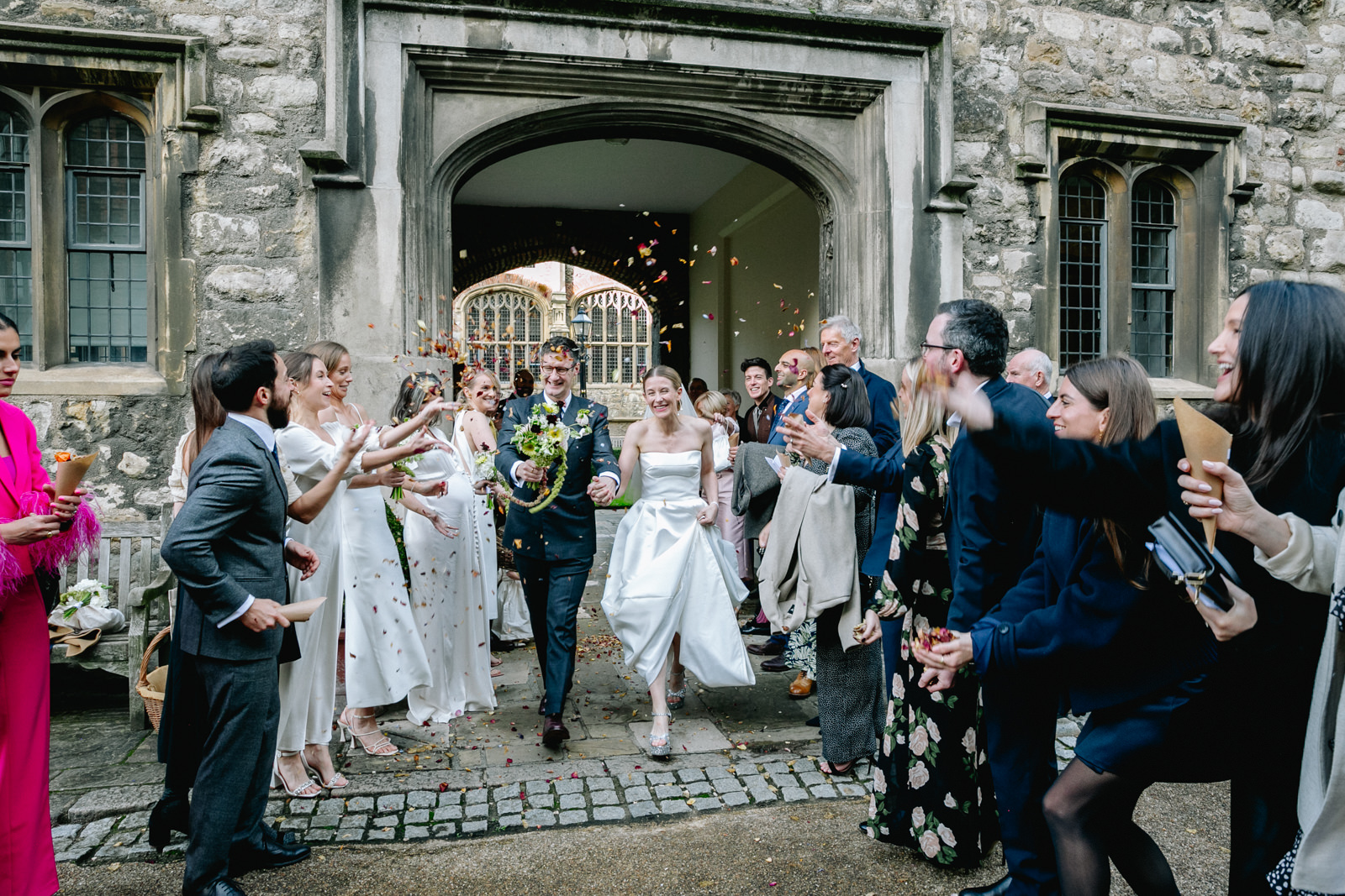 As the newlyweds emerged, hand in hand, under a shower of confetti, the mood shifted from serene reflection to jubilant celebration. The cobbled courtyard buzzed with well-wishers. Then another friend and guest, a Scot called Scot appropriately enough lead them passed the almshouses, down along Smithfield’s and into Clerkenwell for their wedding reception at the renowned restaurant, St John.