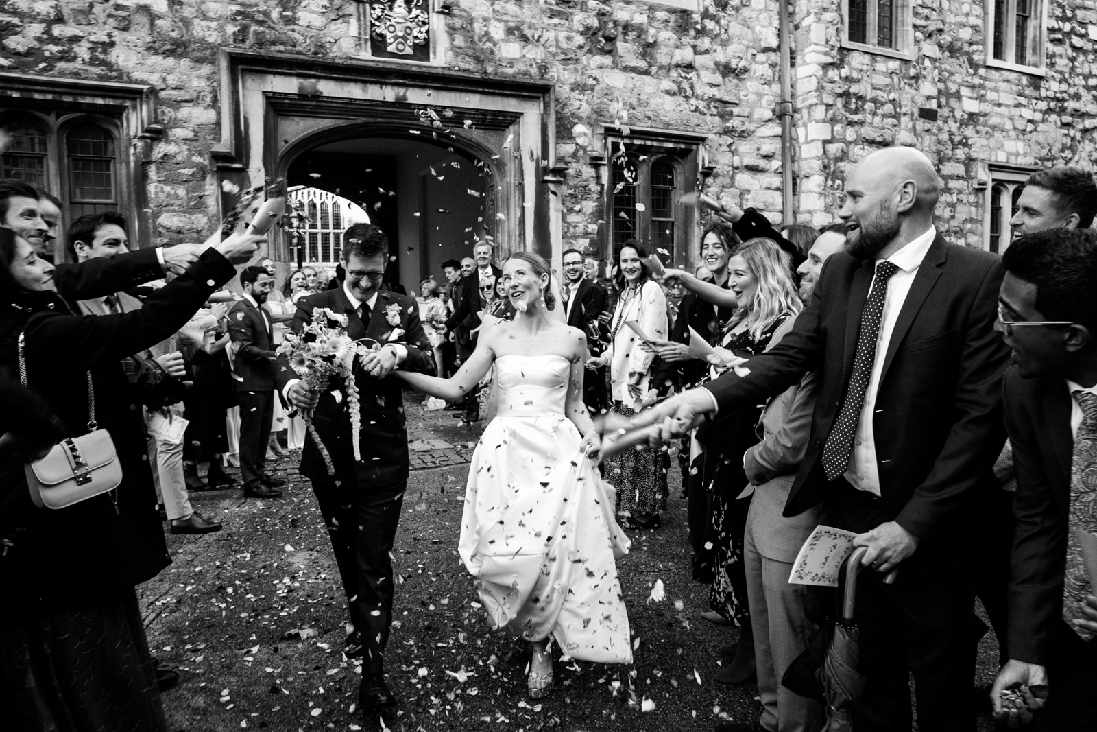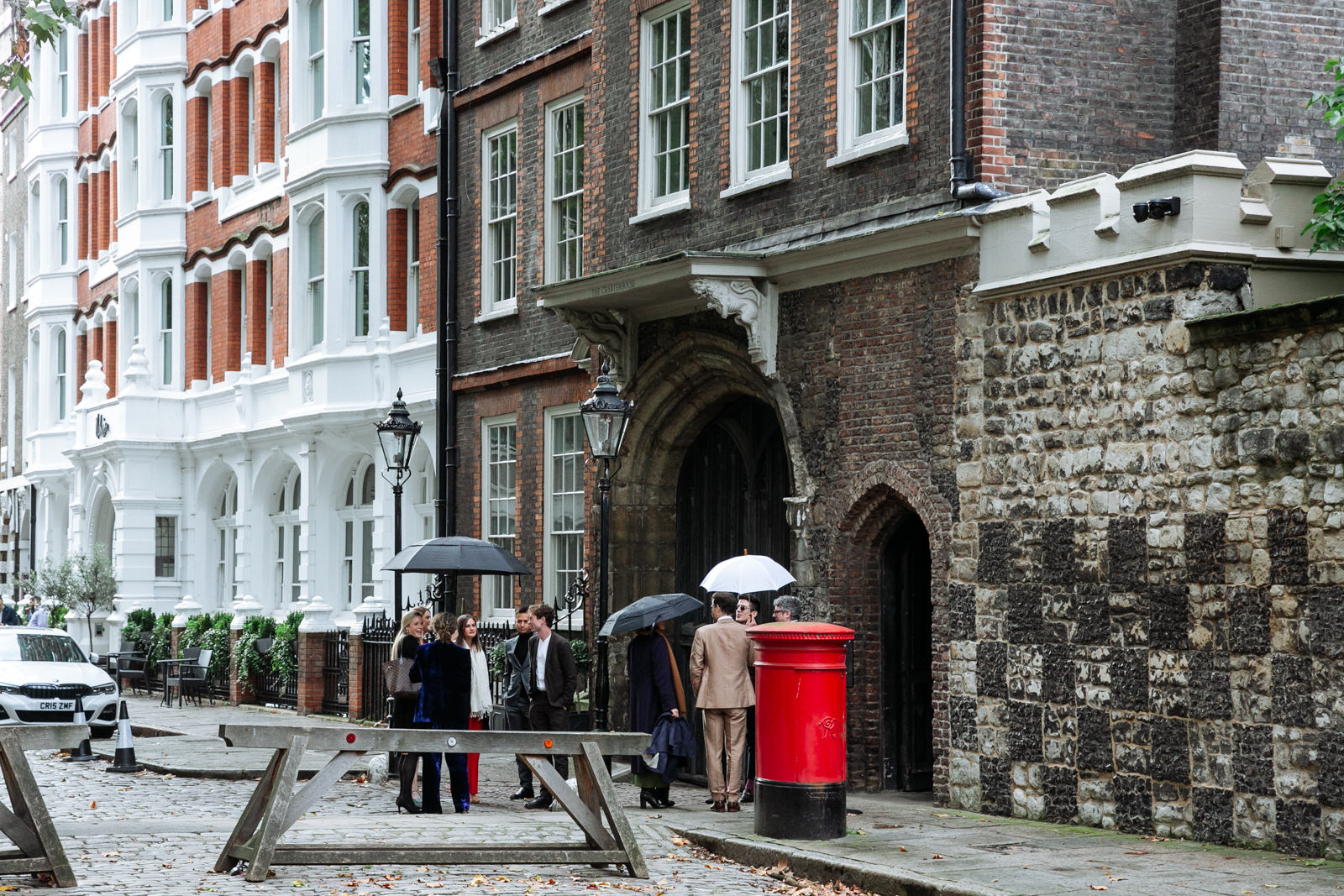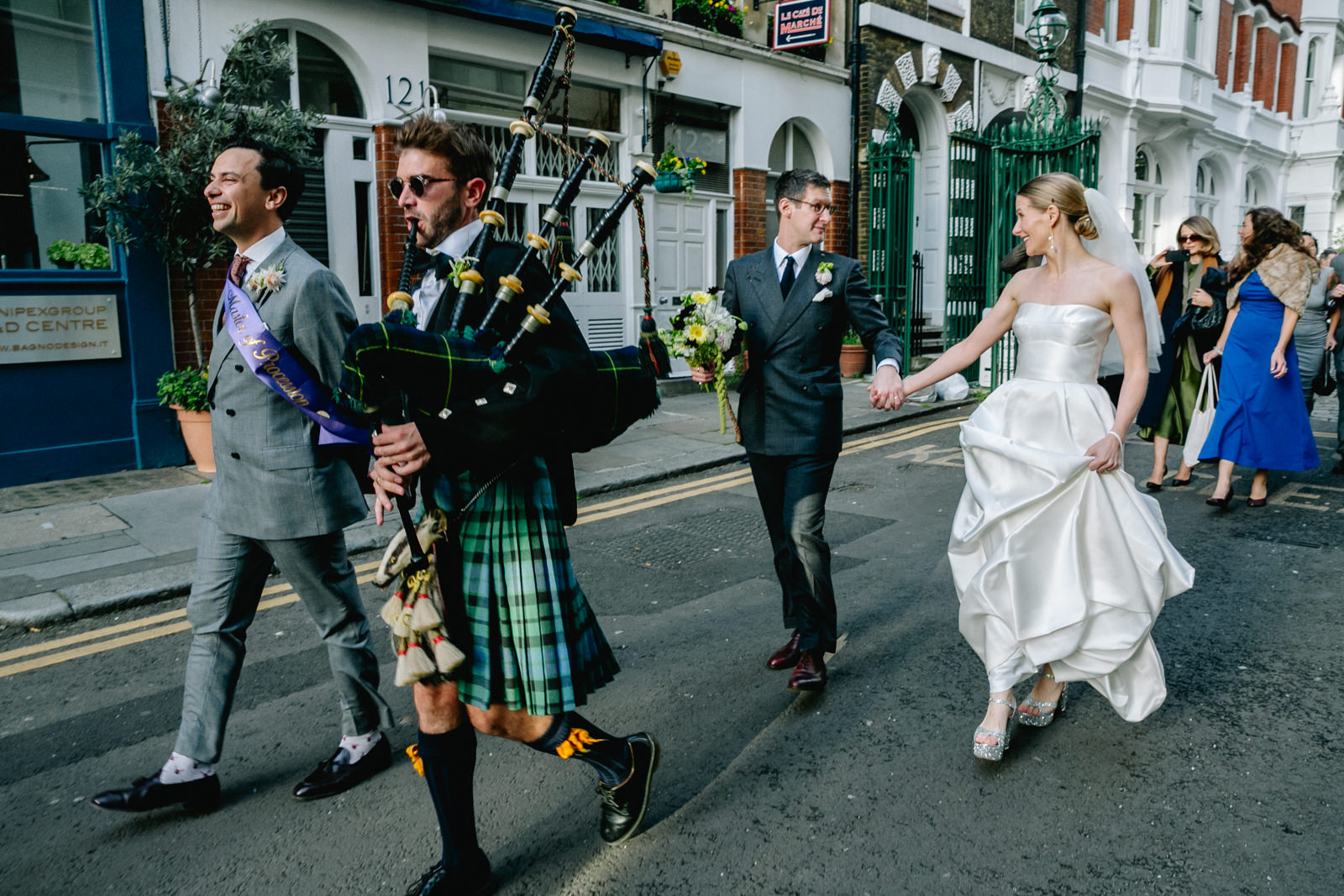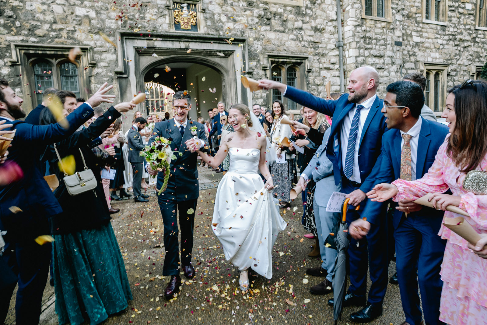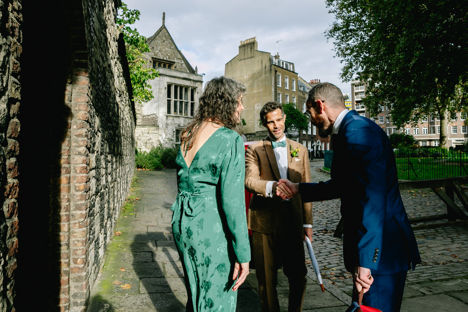 As the newlyweds emerged, hand in hand, under a shower of confetti, the mood shifted from serene reflection to jubilant celebration. The cobbled courtyard buzzed with well-wishers. Then another friend and guest, a Scot called Scot appropriately enough lead them passed the almshouses, down along Smithfield’s and into Clerkenwell for their wedding reception at the renowned restaurant, St John.