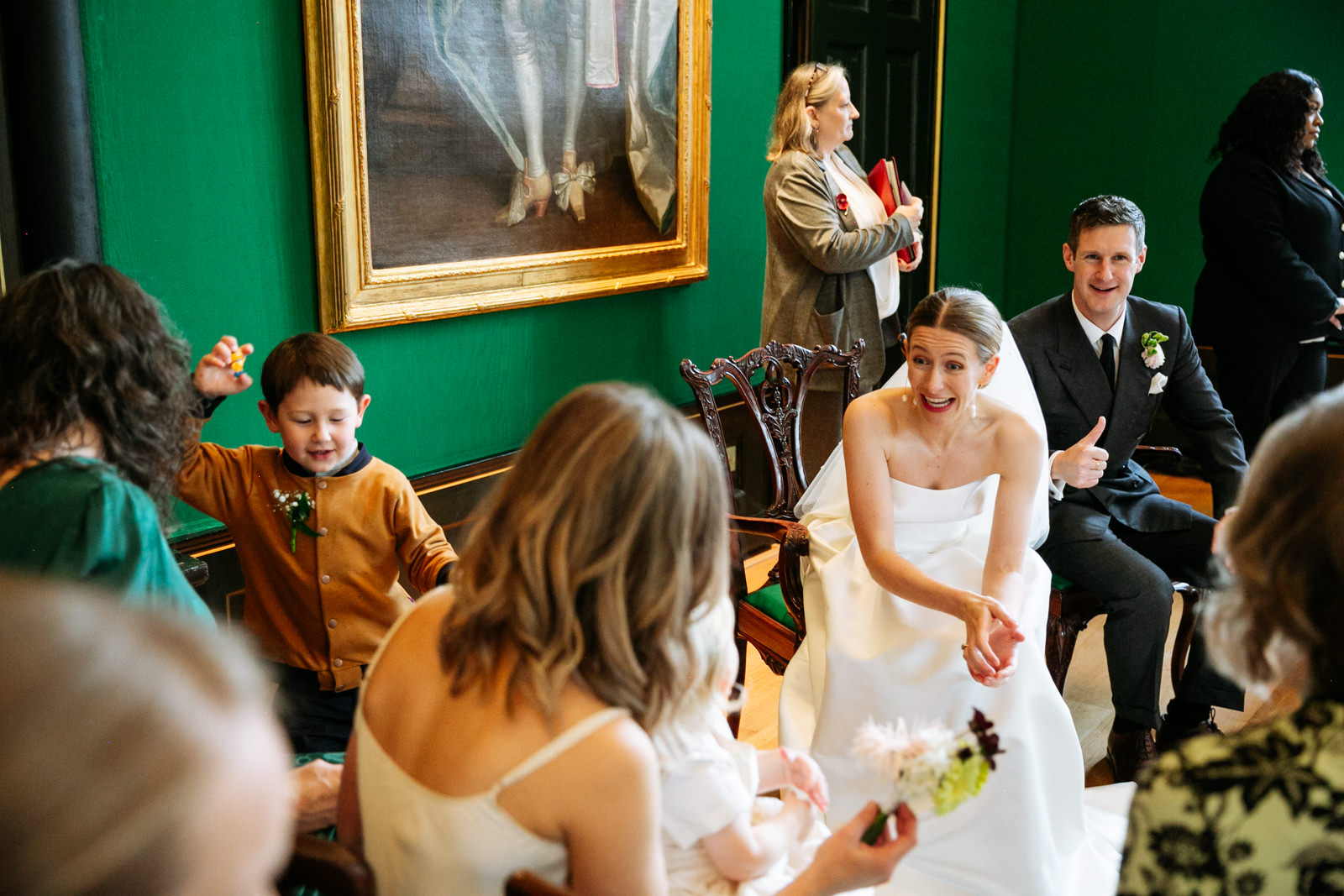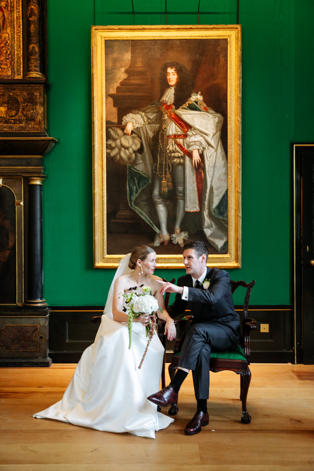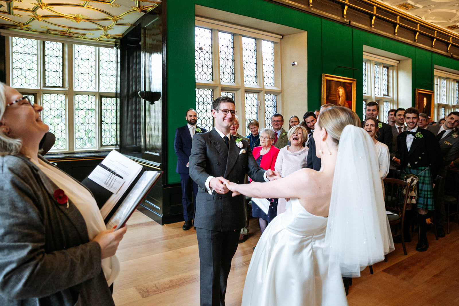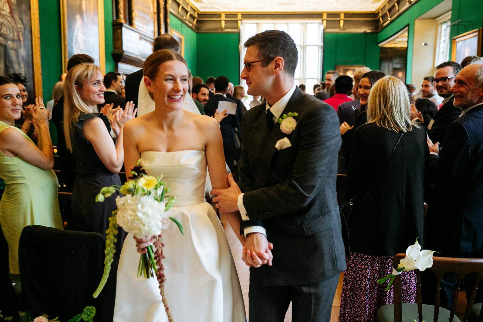 Their vows, exchanged beneath the vaulted golden ceiling above the forest green walls of the long room, were heartfelt and intimate, punctuated by laughter and a rousing rendition of It Must Be Love by Madness played by a friend and guest on a grand piano nestled in the corner of the room. It was a brilliant counterpoint to the stately hallowed halls while being perfectly in keeping with the entire mood of the ceremony.
