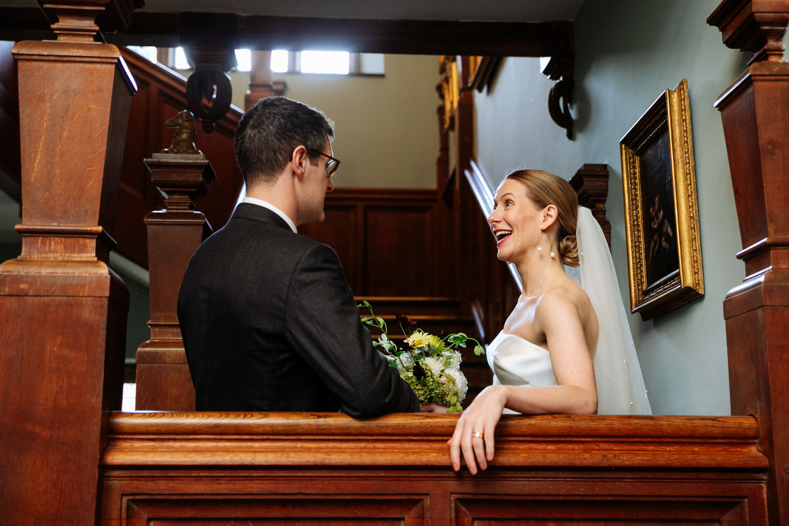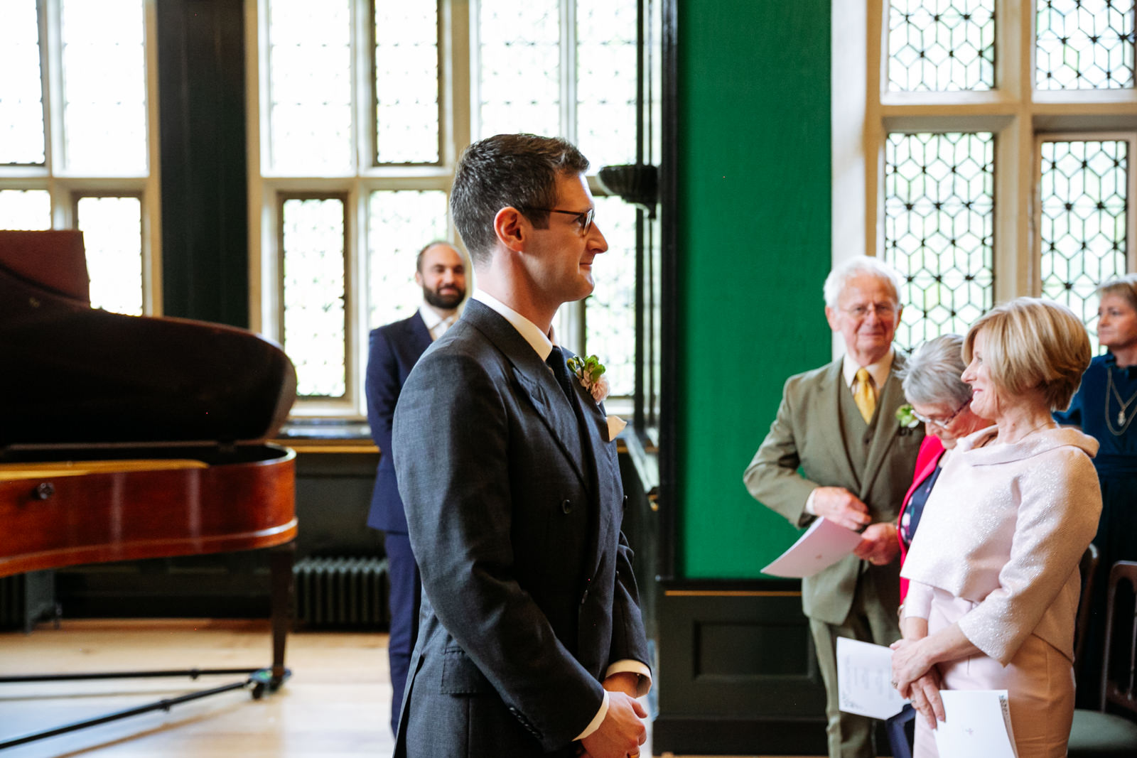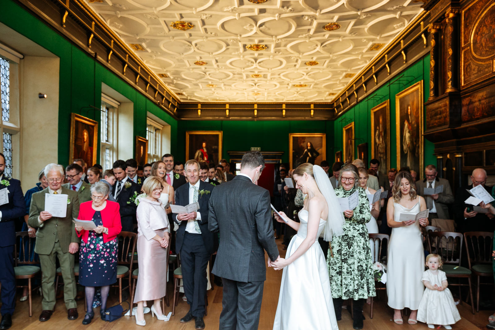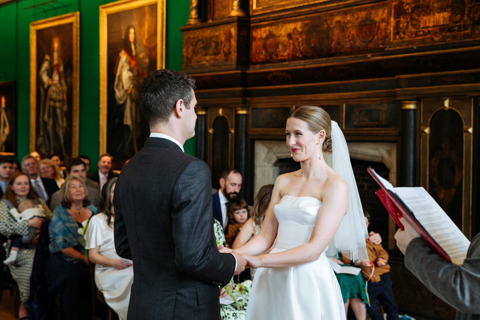 Their vows, exchanged beneath the vaulted golden ceiling above the forest green walls of the long room, were heartfelt and intimate, punctuated by laughter and a rousing rendition of It Must Be Love by Madness played by a friend and guest on a grand piano nestled in the corner of the room. It was a brilliant counterpoint to the stately hallowed halls while being perfectly in keeping with the entire mood of the ceremony.